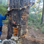 Algunos humanos elegían las cuevas para vivir, y desde entonces aprendieron a usar los recursos de la resina del pino para poder iluminarse. Durante muuuchos años, uno de los oficios principales de esta zona era trabajar como resinero, y aprovechar este material para un montón de cosas. Parecía que se estaba perdiendo ese oficio, pero lo hemos conseguido recuperar. Hoy en día, los humanos ya no viven en cuevas, pero algunos gnomos sí. Este pinus pinaster (resinero) se ha convertido en un hogar de gnomos, ¿llegas a asomarte por una de las ventanitas? Ten cuidado con que se te quede un dedo pegado.